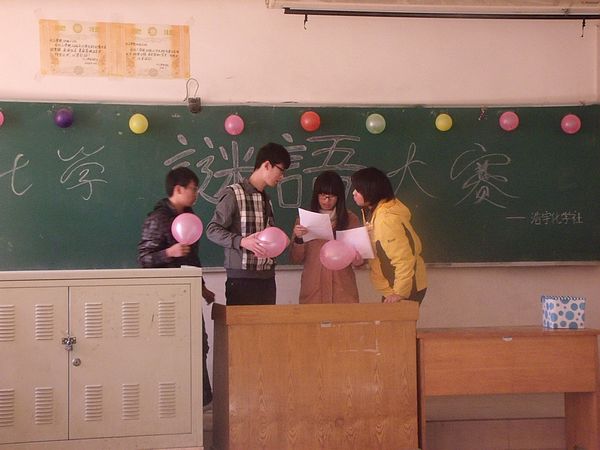 增强化学素养,开阔化学眼界, 11月11日,由浩宇化学社举办的化学谜语大赛在13号教学楼401举行,浩宇化学社社长辛宇飞作为评委参加了比赛。