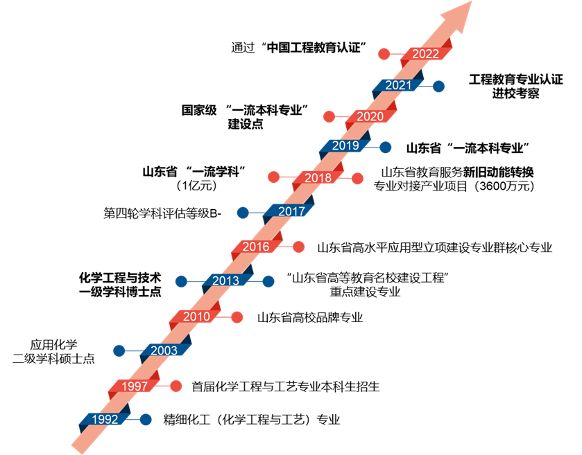 山东理工大学“化学工程与工艺”专业是bw必威西汉姆联官方网站办学历史悠久、教学和科研能力较强的专业之一(图1)。1997年首届招生化学工程与工艺本科;2003年建成化学工程与技术一级学科硕士点;2013年建成化学工程与技术一级学科博士点,同年本科一批志愿招生,并被确定为“山东省高等教育名校建设工程”重点建设专业;2018年入选山东省“一流学科”立项建设(1亿元资金支持),并入选山东省首批教育服务“新旧动能转换”专业对接产业项目核心专业(3600万元资金支持),同年,被评为首批山东省产教融合示范性品牌专业;2019年入选山东省“一流本科专业”;2020年入选“国家级一流本科专业建设点”;2022年专业通过了中国工程教育专业认证,专业培养标准达到国际实质等效。