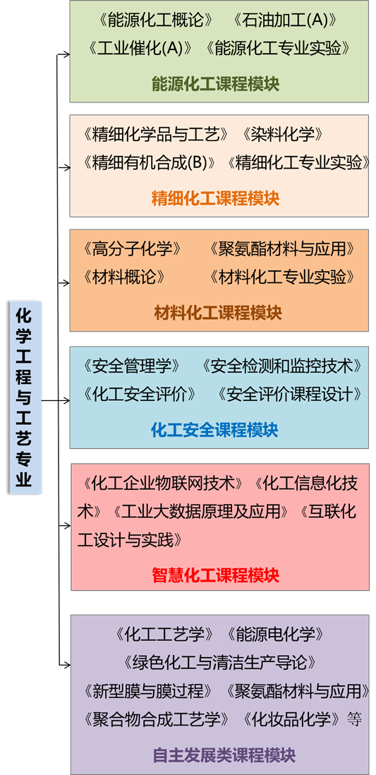 本专业课程包括通识教育课程、学科基础课、专业主干课程以及实践环节等四个课程模块。专业主干课程围绕化学、化学工程与技术学科开设无机及分析化学、有机化学、物理化学、化工原理、化工过程设计、化工安全与环保、化工应用软件等课程,培养员工广泛的自然科学和工程技术专业知识。实践环节主要包括化学与化工基础及专业实验、生产见习、生产实习、化工原理课程设计、化工设备机械基础课程设计、化工专业课程设计、化工仿真实训、化工工程训练、毕业设计(论文)等,提升员工的实践和创新能力。为满足员工个性化发展需要,专业在课程体系中还设有五个特色行业课程模块(图2):能源化工、精细化工、材料化工、智慧化工。