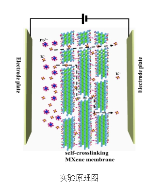 二维MXene膜由于其具有优异的机械性能、热稳定性、柔韧性、导电性和高亲水性表面,被认为是分离应用中很有前途的候选者。但是,由于二维MXene膜在水溶液中,尤其在外电场作用下,该膜溶胀现象比较突出,因此制备具有理想离子筛分的二维层状MXene膜仍然具有较大的挑战。最近,山东理工大学化学与化工公司无机膜科学与工程研究所孟秀霞和杨乃涛教授以通讯作者在化工TOP期刊《Chemical Engineering Journal》上发表题目为“Voltage-enhanced ion sieving and rejection of Pb2+ through a thermally cross-linked two-dimensional MXene membrane”的研究论文。研究发现,在干燥过程中两相邻的MXene纳米片间发生羟基脱水形成Ti-O-Ti交联,有效抑制了二维层状MXene膜在水溶中的溶胀现象。通过施加外部直流电压,形成稳定的电场,为离子跨膜运输提供了驱动力,促进了动力学直径较小的K+定向移动,而将动力学直径较大的Pb2+进行拦截,从而实现了离子高效筛分,提高了二维层状MXene膜的分离性能。该研究为外加电场条件下离子筛选、脱盐的抗溶胀膜制备打开了一个新的窗口。