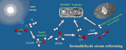该工作提出了以甲醛为原料催化重整制氢的新思路,为同时解决能源和环境问题提供了新途径。为高效转化甲醛制氢,该工作设计开发了一种可溶盐NaCl担载的Co基催化剂,取得了良好的甲醛制氢性能:反应温度为450 °C,空速为9400 h-1时,8%-Co/NaCl取得了高达92.2%的H2产率和较高的稳定性。研究发现,金属Co与NaCl之间的强相互作用诱导生成了具有六方密堆结构的Co纳米片,该物相与面心立方结构的Co纳米颗粒相比具有更高的甲醛蒸汽重整制氢活性和抗积碳性能。Co原子化学价的转变以及NaCl在高温条件下的离子电导能够加速反应中的电荷迁移从而提升催化性能。综合分析实验研究结果和理论计算结果证明,WGS反应是甲醛蒸汽重整制氢反应的控速步骤。