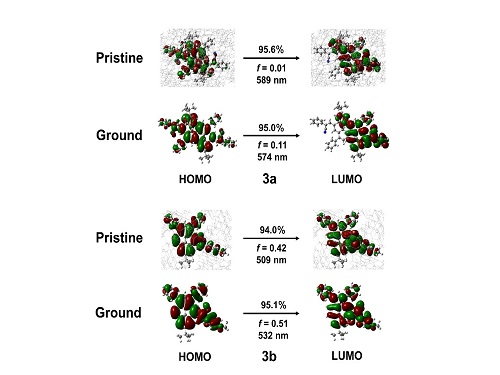 压致变色材料因在压力传感、光学记录和发光器件等领域具有着广阔的应用前景,备受国内外科研工作者的关注。由于芘自身的共轭结构极易行成π-π堆积,导致分子聚集后发光猝灭,制约了这类材料的实际应用。本工作中研究者巧妙利用取代基效应设计并合成了两种氰基乙烯功能化芘类发光材料。有趣的是,仅仅通过一个取代基的改变,两种化合物表现出截然不同的刺激响应行为,且具有极好的可逆性。在机械研磨力刺激下,可以分别观察到压致蓝移(12 nm)和压致红移(47 nm)现象。单晶分析和理论计算发现,研磨会使得晶态固体中的二聚体发生滑移,从而减弱了π-π相互作用,导致发光蓝移并增强;不同与此,研磨会破坏晶态固体中单体的运动受限状态,从而加强了分子运动自由性和构型平面化,导致发光红移并减弱。研究成果不仅加深了对压致变色现象的理解,还为芘类压致变色材料的构建提供了新策略。