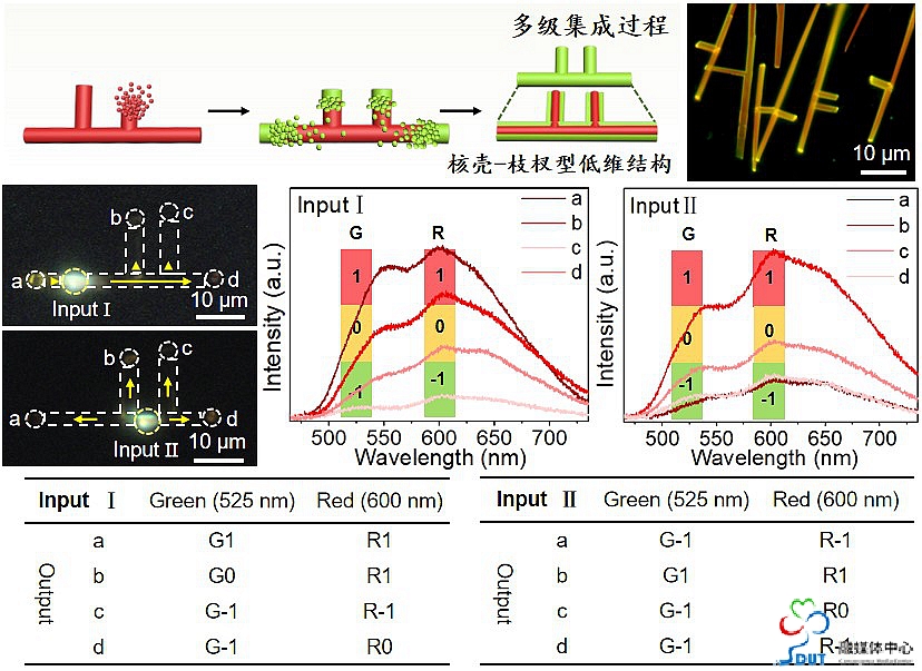 基于此,蔺红桃等研究人员从有机电荷转移共晶的结构相容性出发,成功构建了枝杈型、核壳型以及枝杈-核壳集成型的多级有机微结构,为创建集成光电子学有机微纳结构提供了全新思路。其中,枝杈-核壳集成微结构同时具有多色波导特性和多通道波导输出特性,可以成功地应用到多种编码/解码特性的光学逻辑门。