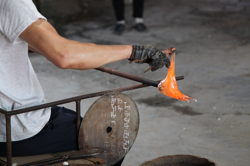 随后,琉璃厂工作人员带领实践团成员进入工作车间、了解琉璃制作的传统手艺和制作方法。化料,挑料,吹制,塑形,退火,一步步的制作手法,蕴含着手工艺者辛勤劳作的汗水和中华传统工艺的魅力。在工作人员的帮助下,实践团成员亲身体验了琉璃的制作。