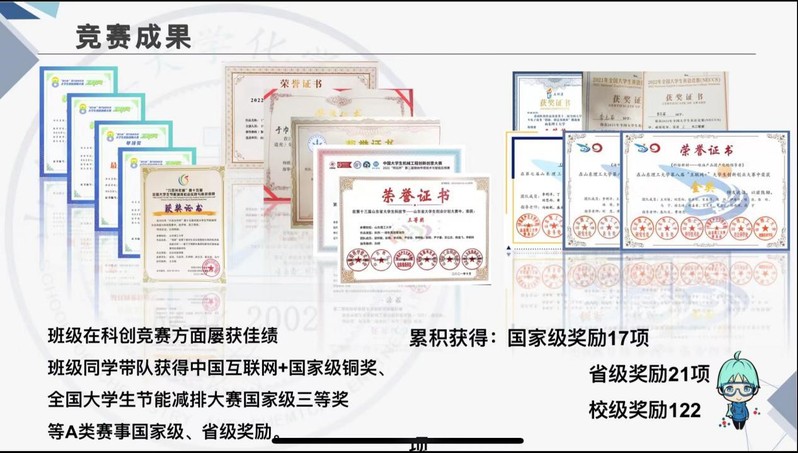 走的最慢的人,只要他不丧失目标,也比漫无目的地徘徊的人走得快;没有追求的人很快就会消沉,哪怕只有不足挂齿的追求也总比没有好。应化2002班便是一个有目标、有追求的班级。在科创竞赛方面,班级同学带队获得了中国互联网+国家级铜奖、全国老员工节能减排大赛国家级三等奖等A类赛事的国家级、省级奖励,累积获得了国家级奖励17项,省级奖励21项,校级奖励122项。这些成绩的背后,是班级同学对学术研究的执着追求和不懈努力。为了有更好的未来发展前景,为了有更好的学习奋斗平台,班级大部分同学都不惧考研艰苦,毅然选择在考研的战场上拼刀拼枪。他们在科创竞赛中所积累的知识和经验,也为他们的考研之路提供了有力的支撑。