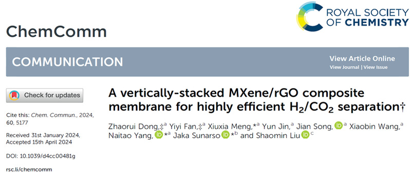 该成果以题为“A vertically-stacked MXene/rGO composite membrane for highly efficient H2/CO2 separation”在Chemical Communication(自然指数期刊)期刊发表(Chem. Commun., 2024,60, 5177-5180)。硕士研究生董昭蕊和范议议博士为共同第一作者,杨乃涛教授、孟秀霞教授和Jaka Sunarso教授为通讯作者。