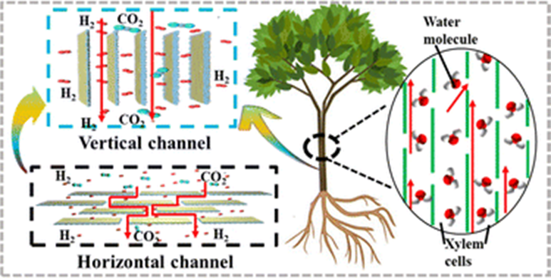 由于膜分离技术具有无相变、能耗低、分离效率高、设备简单占地面积小、操作简单、可连续操作性强等优势,在CO2的捕集和封存方面具有较好的前景。近年来,二维材料以其独特的微结构,在分离膜领域被广泛研究。二维材料分离膜基于传输孔道尺寸筛分机理,以层内的缺陷孔和层间的狭缝孔以及层间间距为传输通道,致使气体分子在膜内的传输路径成“之”字型,传输距离长,阻力大。受水分在树干中垂直传输启发,本研究采用Zn箔还原法制备了自支撑的MXene/rGO膜,结合物理切割组装了了具有垂直通道的MXene/rGO膜(V-MXene/rGO)。与水平阵列膜的平行曲折通道相比,V-MXene/rGO膜的层间通道与气体传输通道平行,扩散阻力较低,气体分子更容易扩散传递,氢气渗透量(2.7×10-7 mol m-2s-1Pa-1)较水平阵列膜高一个数量级,且100 h的连续稳定性测试中无衰减,展现了较好的应用前景。