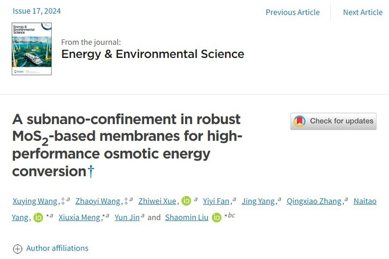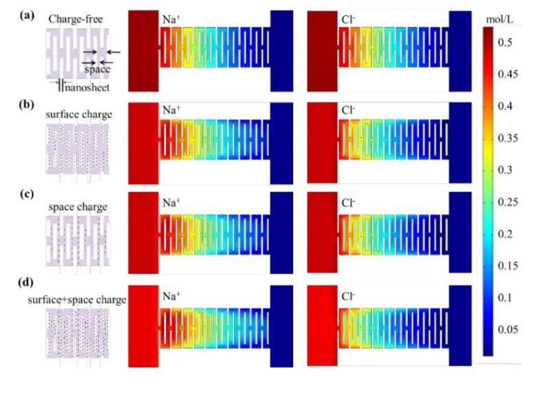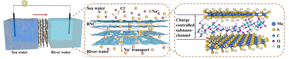 该项工作以环境友好的、带负电荷的BNC和二维MoS2纳米片复合材料为基材,通过简易的实验方法获得了结构稳定、性能优良的复合膜,发现了在二维复合膜的亚纳米通道中,表面电荷和空间电荷的协同作用对促进带相反电荷的离子选择性发挥的重要作用。该研究为海、河水渗透能转化为电能技术的进一步发展打开了希望之门。