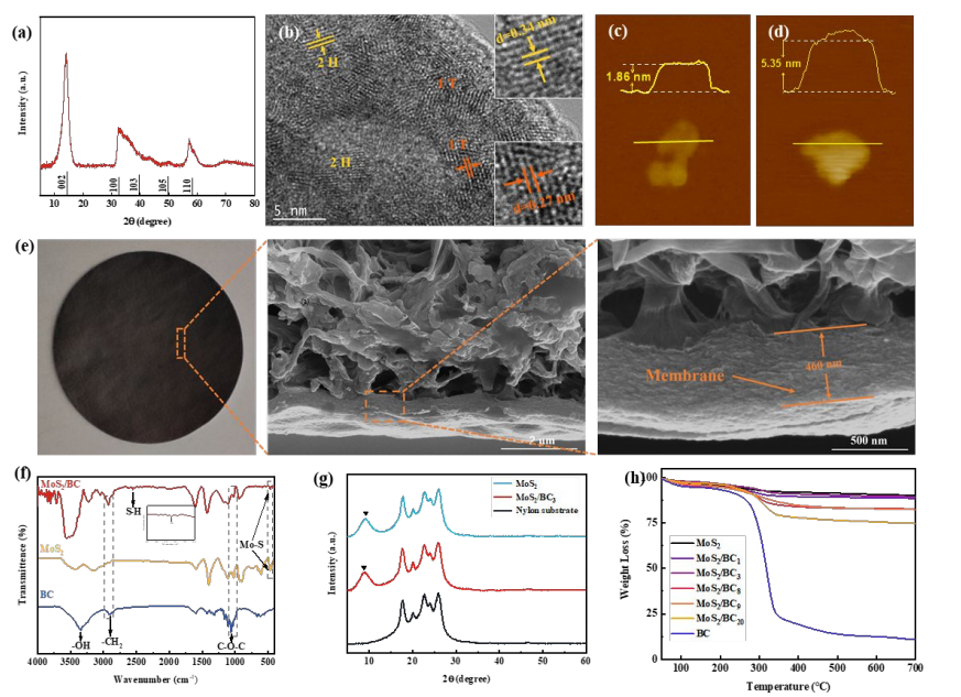 研究发现,该复合膜的强度和稳定性起因于BNC丰富的羟基构建的三维网状结构,并可以与MoS2纳米片通过S-H键紧密结合,使得薄膜内纳米片的层间距被有效调控。