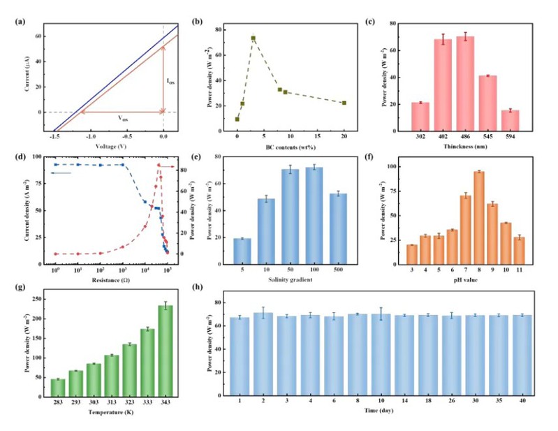 在测试面积为0.78mm2,50倍盐度梯度的模拟海水和河水中,该膜的渗透能转化为电能的功率密度达到73W m-2,大大超过了现有报道的同类膜的性能。在随后40天的稳定性测试中,膜的性能始终未发现衰减,其稳定性也居同类膜之最。
