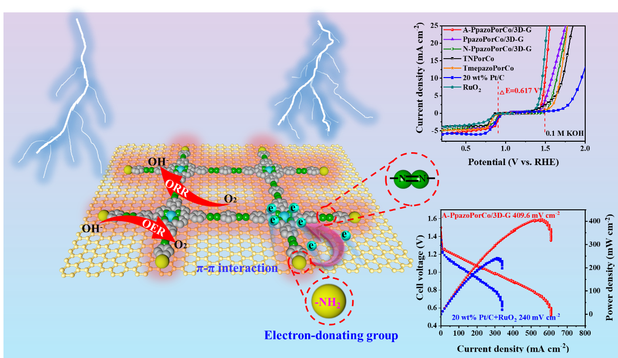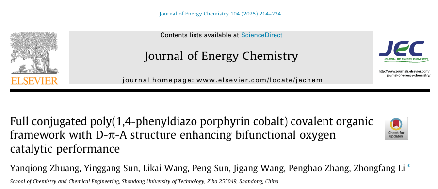 近日,公司燃料电池团队李忠芳教授在全共轭金属卟啉基双功能氧催化剂领域取得重要进展,相关成果以“Full conjugated poly(1,4-phenyldiazo porphyrin cobalt) covalent organic framework with D-p-A structure enhancing bifunctional oxygen catalytic performance”为题发表在化工一区TOP期刊Journal of Energy Chemistry上。(J. Energy Chem. 2025.104: 214-224.)