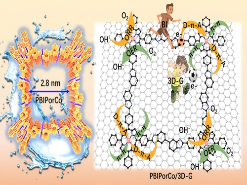 本工作开发了一种新型全共轭聚合金属卟啉基共价有机框架(COF)材料PBIPorCo,通过固载到三维石墨烯(3D-G)表面,构建了PBIPorCo内部“电子供体-电子受体”(D–A)结构及其与3D-G间的π-π相互作用,显著提升PBIPorCo/3D-G催化氧反应双功能性能。PBIPorCo由meso-5,10,15,20-四(4-氰基苯基卟啉)钴(TCNPorCo)与3, 3'-二氨基联苯胺聚合而成,其分子内的苯并咪唑基团作为强电子供体,增强了Co-N4的电子云密度,同时富氮环境加速了氧还原反应(ORR)中的质子化过程。固载于3D-G后,通过π-π相互作用优化PBIPorCo/3D-G内部电子转移,结合3D-G的高导电性和多孔结构,实现了催化活性与稳定性的协同提升。性能测试表明,PBIPorCo/3D-G催化ORR半波电位(E1/2)为0.90 V vs. RHE,催化氧析出反应(OER)过电位Ej=10仅290 mV(10 mA/cm2),双功能催化性能电位差(ΔE)低至0.62 V。在锌-空电池(ZABs)中,液态体系(L-ZABs)峰值功率密度达356.8 mW/cm2,循环稳定性超200 h;柔性全固态电池(F-ZABs)功率密度65.5 mW/cm2,弯曲状态下仍保持稳定。密度泛函理论(DFT)证实,苯并咪唑基团作为供电子基团提升Co-N4电子云密度和PBIPorCo/3D-G二者之间存在π-π相互作用的电子协同效应是性能提升的关键。该工作为高效全共轭聚合金属卟啉基COFs氧反应催化剂的设计提供了新策略,在燃料电池、全水分解及柔性储能器件中具有广阔应用前景。