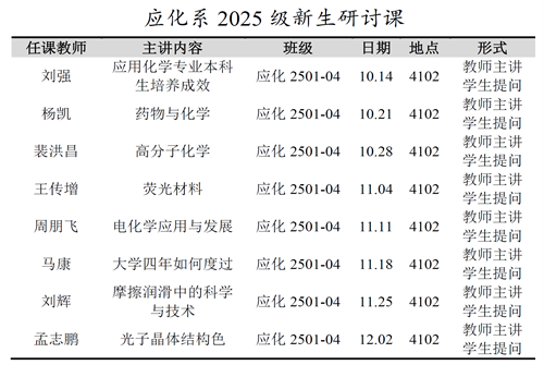 自10月中旬起,应用化学系为2025级新生精心打造的新生研讨课开讲。本次课程旨在引导新生“开好头、起好步”,内容聚焦应化专业建设成效、特色模板培养、学术前沿动态等,邀请了系内多位中青年骨干教师担任主讲,为同学们描绘出清晰的专业发展蓝图,奠定了坚实的大学第一块基石。
