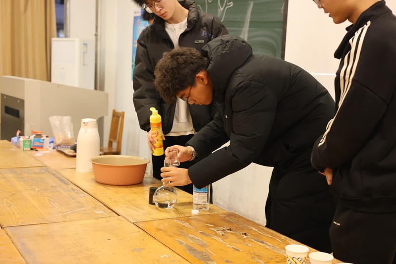 实验展示环节精彩纷呈。三组同学依次呈现“法老之蛇”“分层气泡”“大象牙膏”实验,通过小苏打、过氧化氢等常见材料,借助燃烧、中和、催化等反应,呈现出蛇形残渣、分层气泡、彩色泡沫等直观现象,让抽象化学知识变得生动有趣。