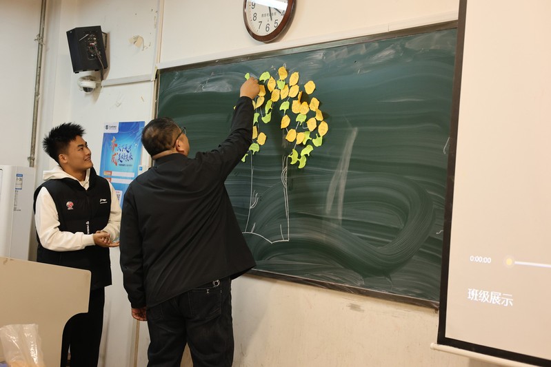 班级愿景树环节温情满满,同学们将未来期许与班级祝福写在便利贴上,贴成繁茂“树冠”,杨乃涛在树干签名,象征公司为学子成长筑牢根基。